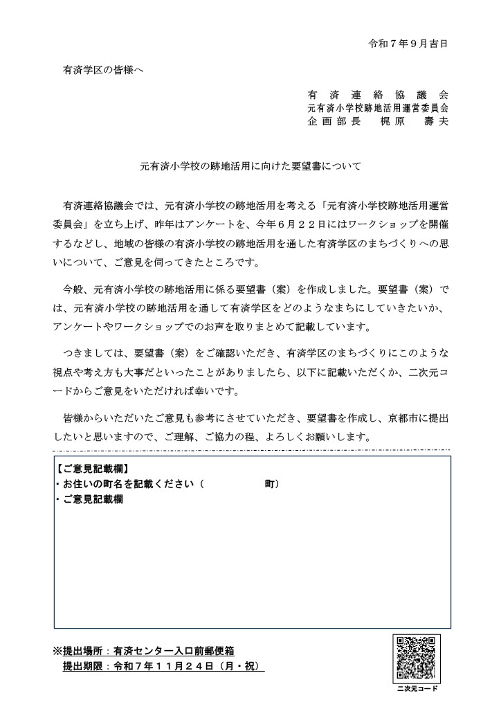 元有済小学校跡地活用に関する要望書
